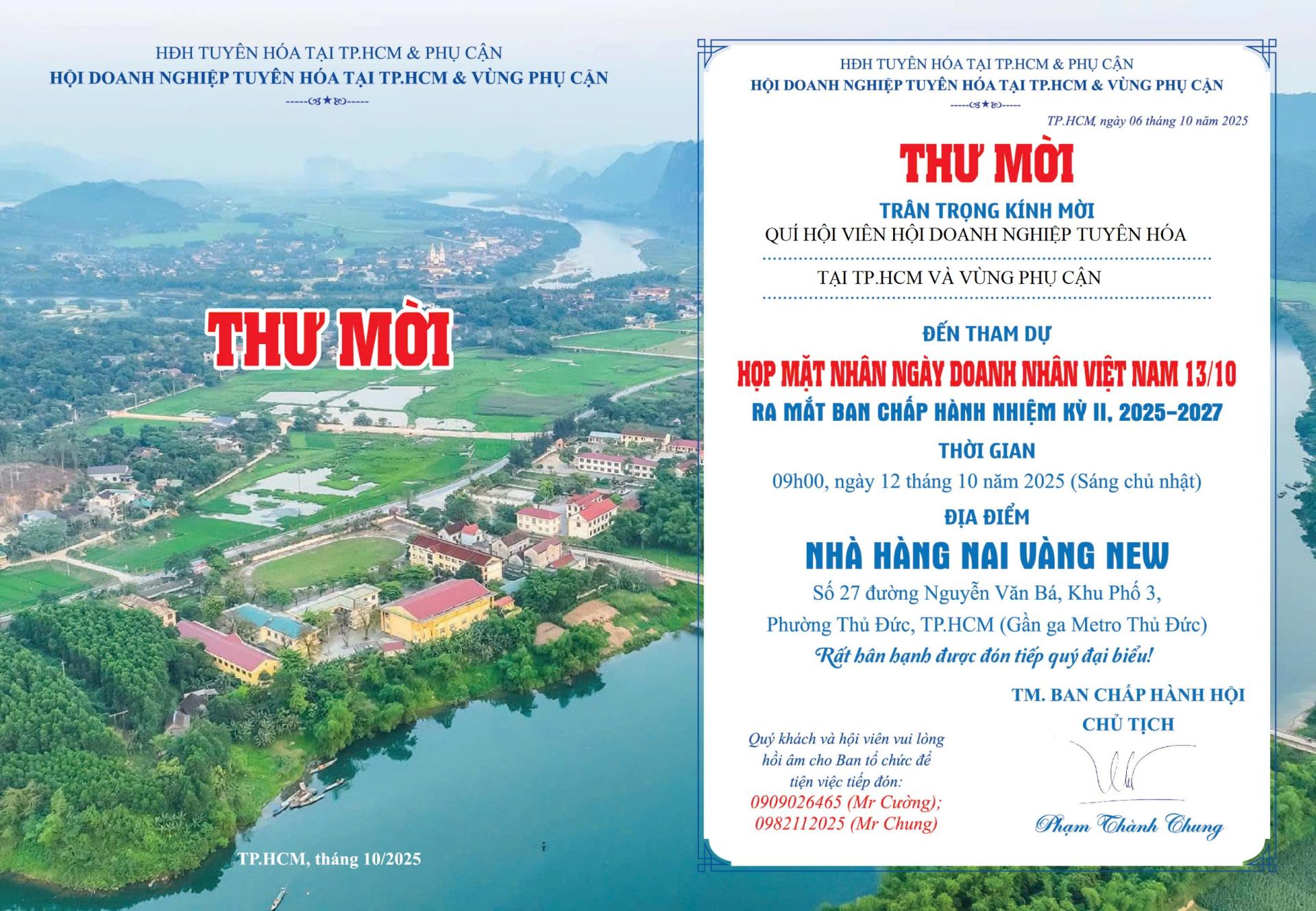 Kỷ niệm Ngày Doanh nhân Việt Nam năm nay, Hội tổ chức cuộc gặp mặt lúc 9 giờ ngày 12-10 tại Nhà hang Nai Vàng New (27 Nguyễn Văn Bá, Thủ Đức cũ; cạnh ga MeTro Thủ Đức) để quí anh chị em (cả trong hội và những anh chị em chưa tham gia hội) có dịpgặp gỡ, động viên nhau tiếp tục vươt khó, thu nhiều kết quả trong hoạt động sản xuất, kinh doanh, đóng góp vào sự phát triển của đất nước. Cũng nhân dịp này, Hội sẽ công bố Ban Chấp hành cho nhiệmkỳ II (2025 - 2027) vừa được Hội Đồng hương Tuyên hóa tại TP.HCM và vùng phụ cận ban hành quyết định chuẩn y, để tiếp tục điều hành hoạt động của Hội.
