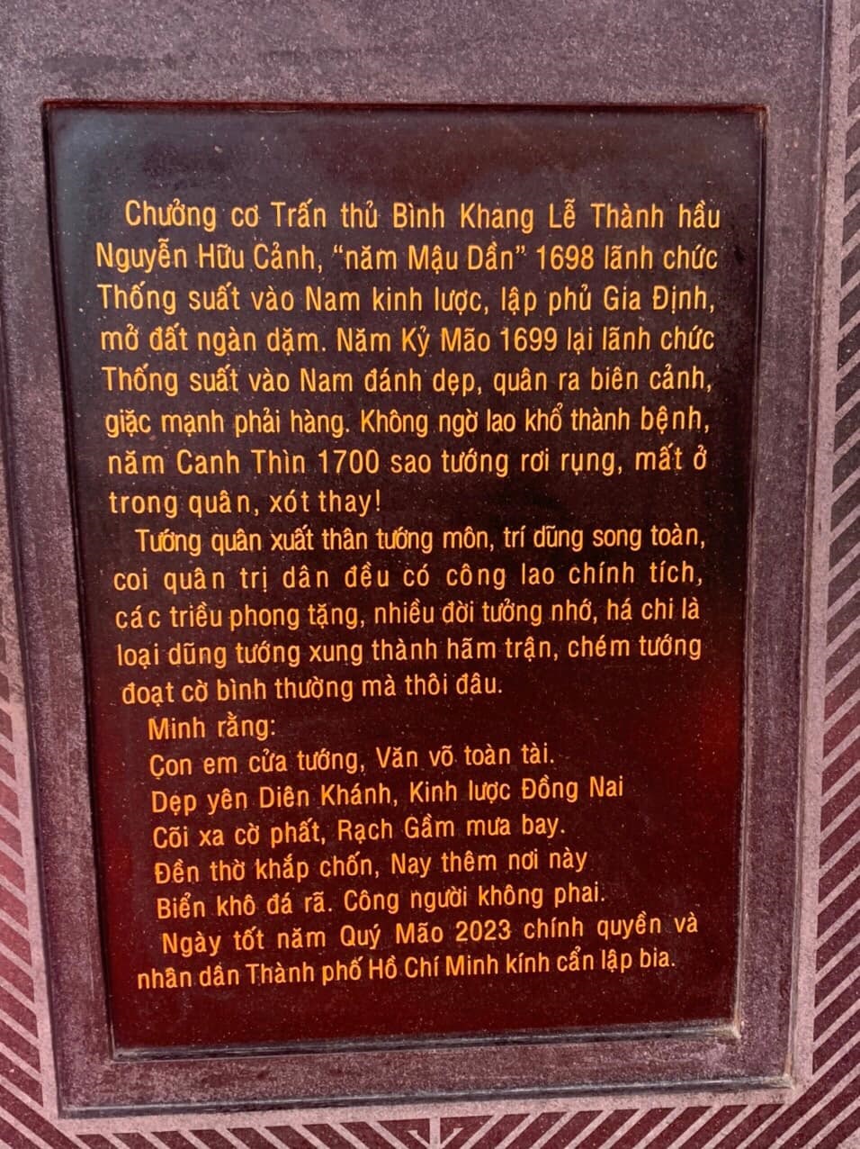 Lễ giỗ Đức lễ Thành hầu Nguyễn Hữu Cảnh lần thứ 323 (1700-2023) và lễ công bố nội dung văn bia Đức lễ Thành hầu Nguyễn Hữu Cảnh đã diễn ra ngày 3-7 (nhằm ngày 16-5 năm Quý Mão) tại đền thờ Đức lễ Thành hầu Nguyễn Hữu Cảnh ở Công viên Lịch sử - Văn hóa Dân tộc TP Thủ Đức, TP HCM.
