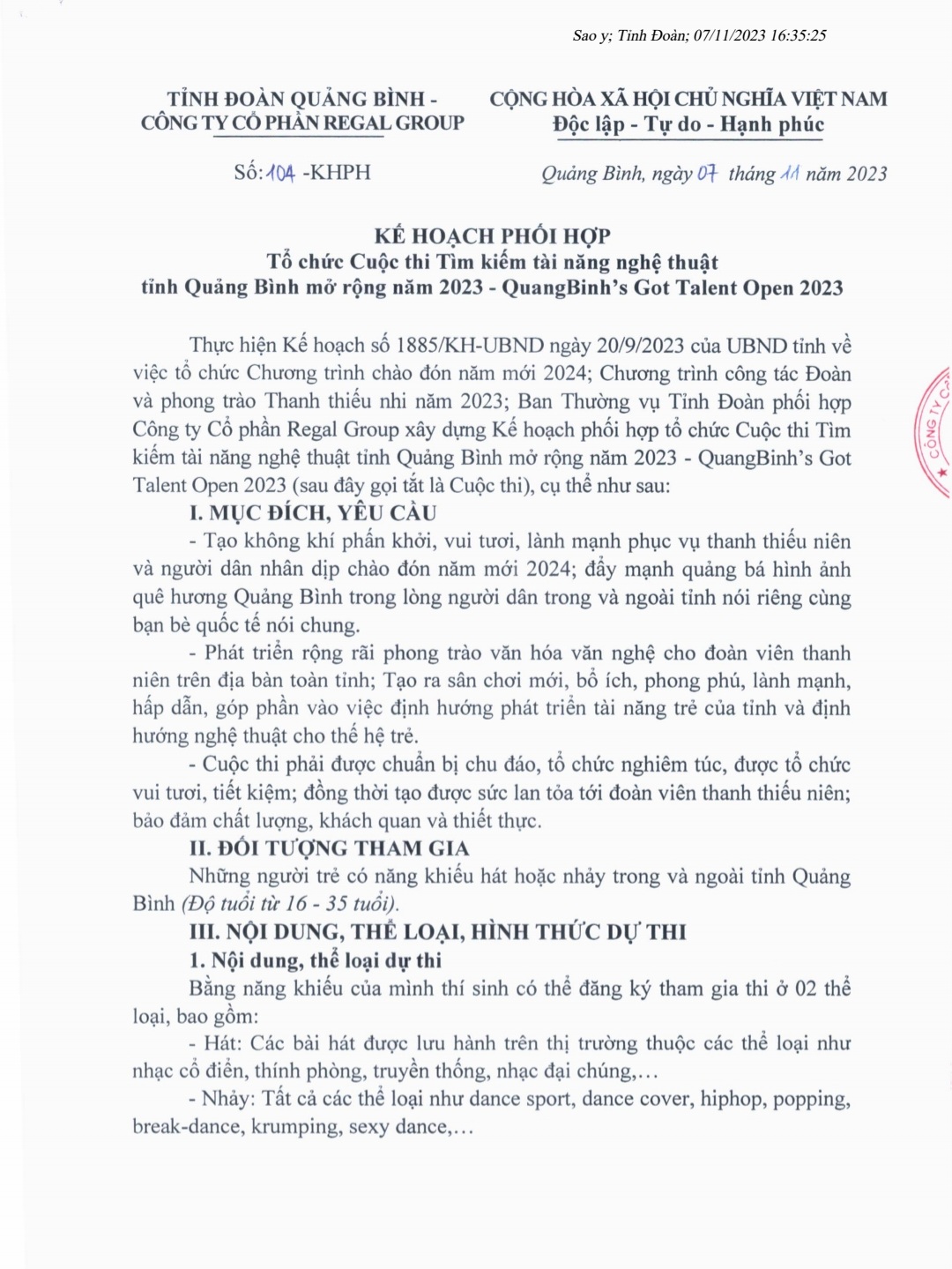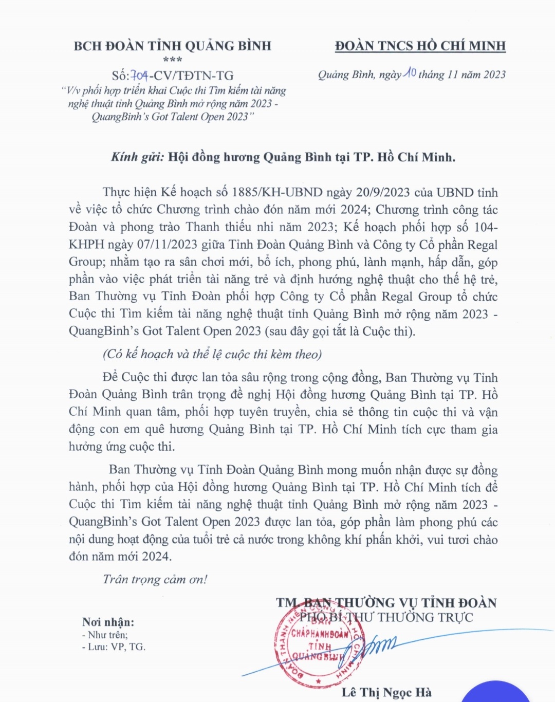 Tỉnh Đoàn Quảng Bình vừa có văn bản thông báo mời con em Quảng Bình khắp mọi nơi tham gia cuộc thi ca hát trên online nhằm phát hiện tài năng trẻ. Hội Đồng hương Tuyên Hóa tại TP.HCM kính thông báo cho hội viên động viên con cháu tham gia nhé. Trân trọng!