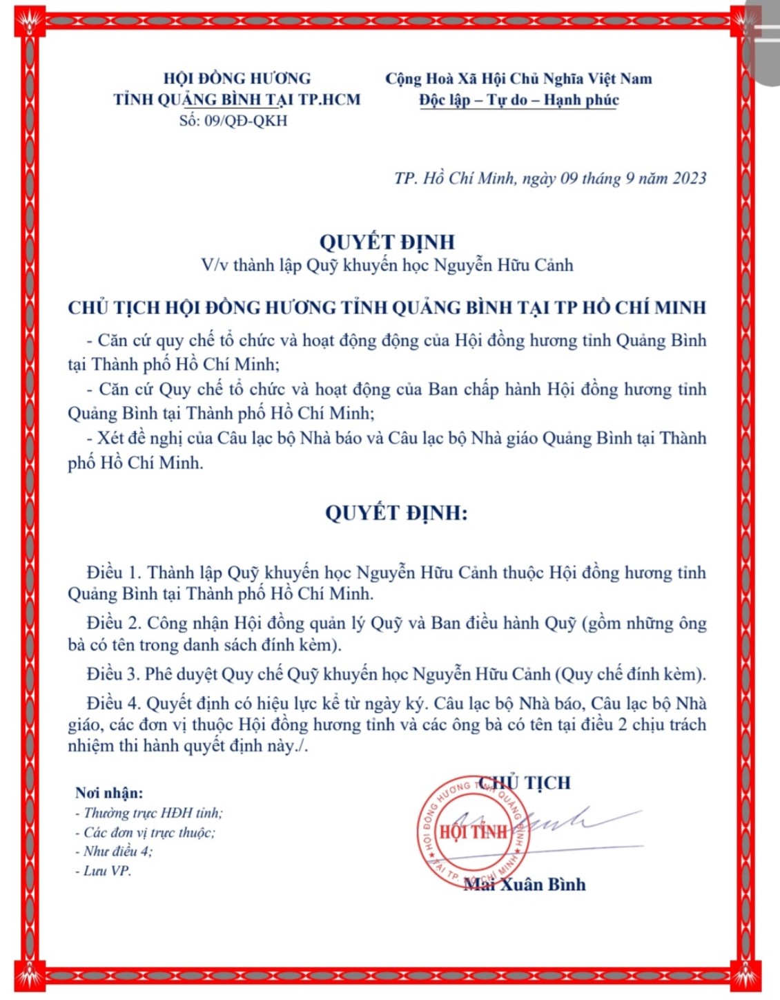 (Đính kèm Quyết định số 09/QĐ-QKH, ngày 09 tháng 9 năm 2023 của Hội đồng hương tỉnh Quảng Bình tại Thành phố Hồ Chí Minh)
